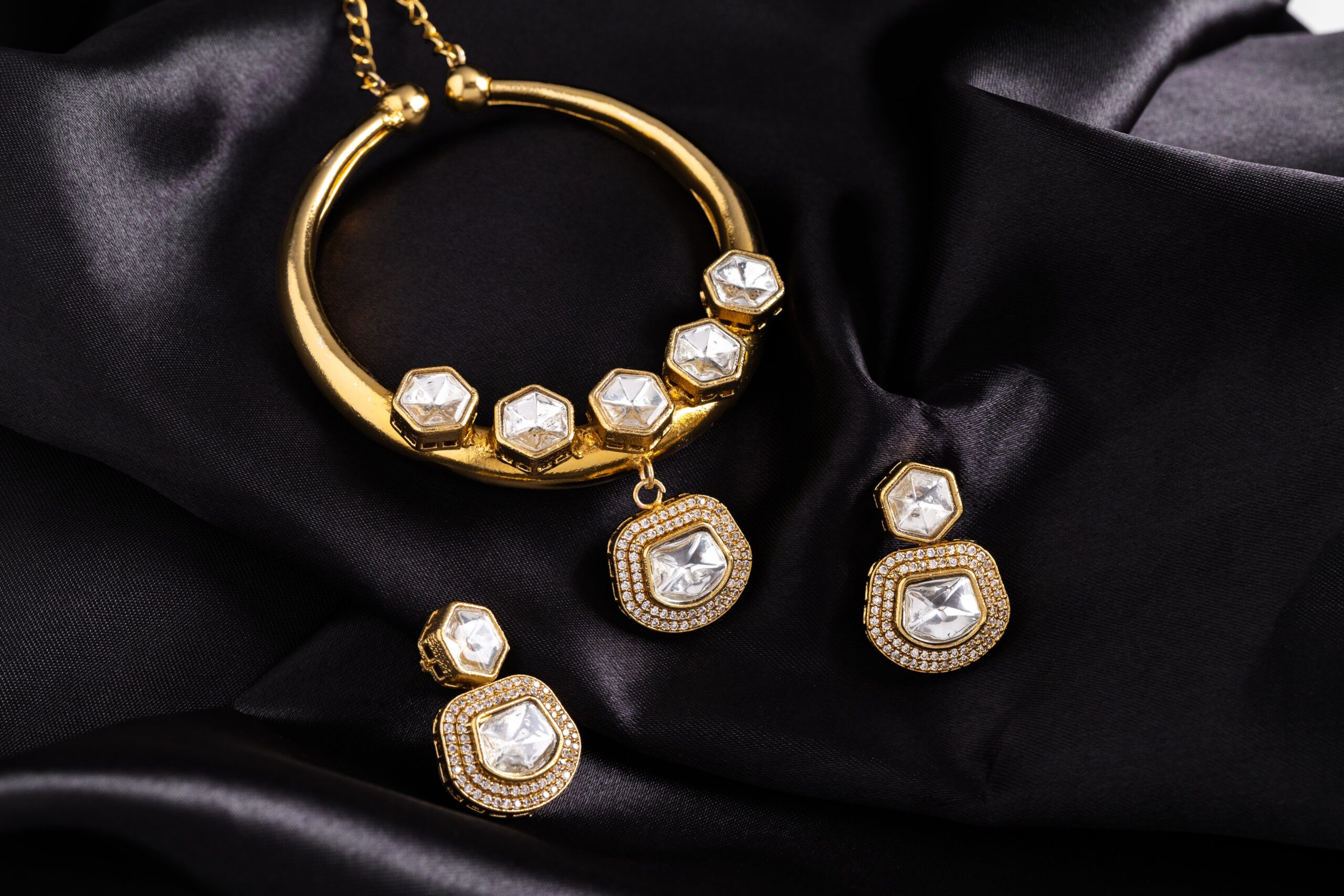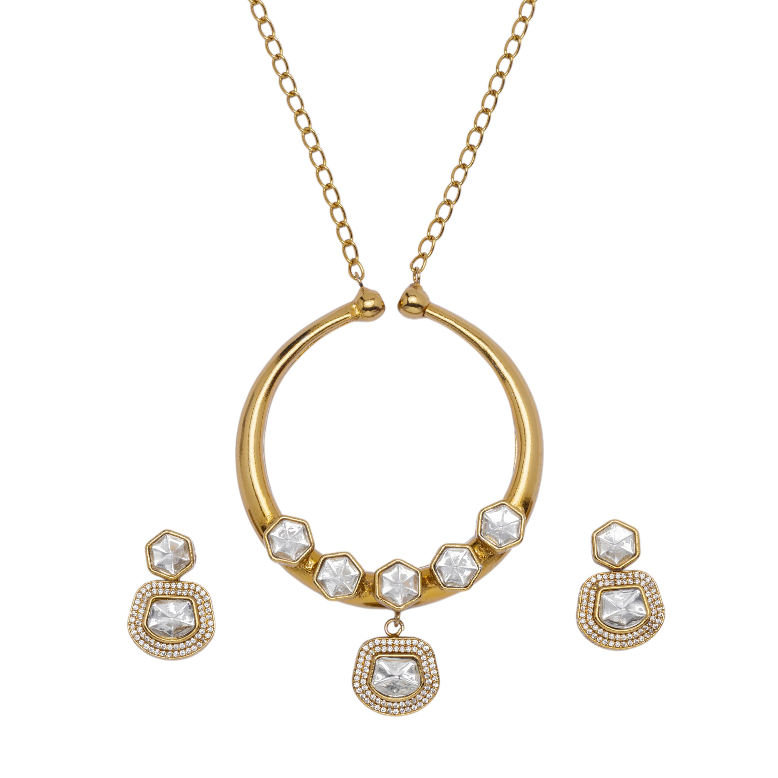 TIMELESS PENDANT DESIGN WITH POLKI AND AMERICAN DIAMOND STONES – This gold-plated Polki pendant set features a graceful crescent design inspired by the traditional hasli, with hexagonal Polki stones and American Diamond accents that radiate elegance.
