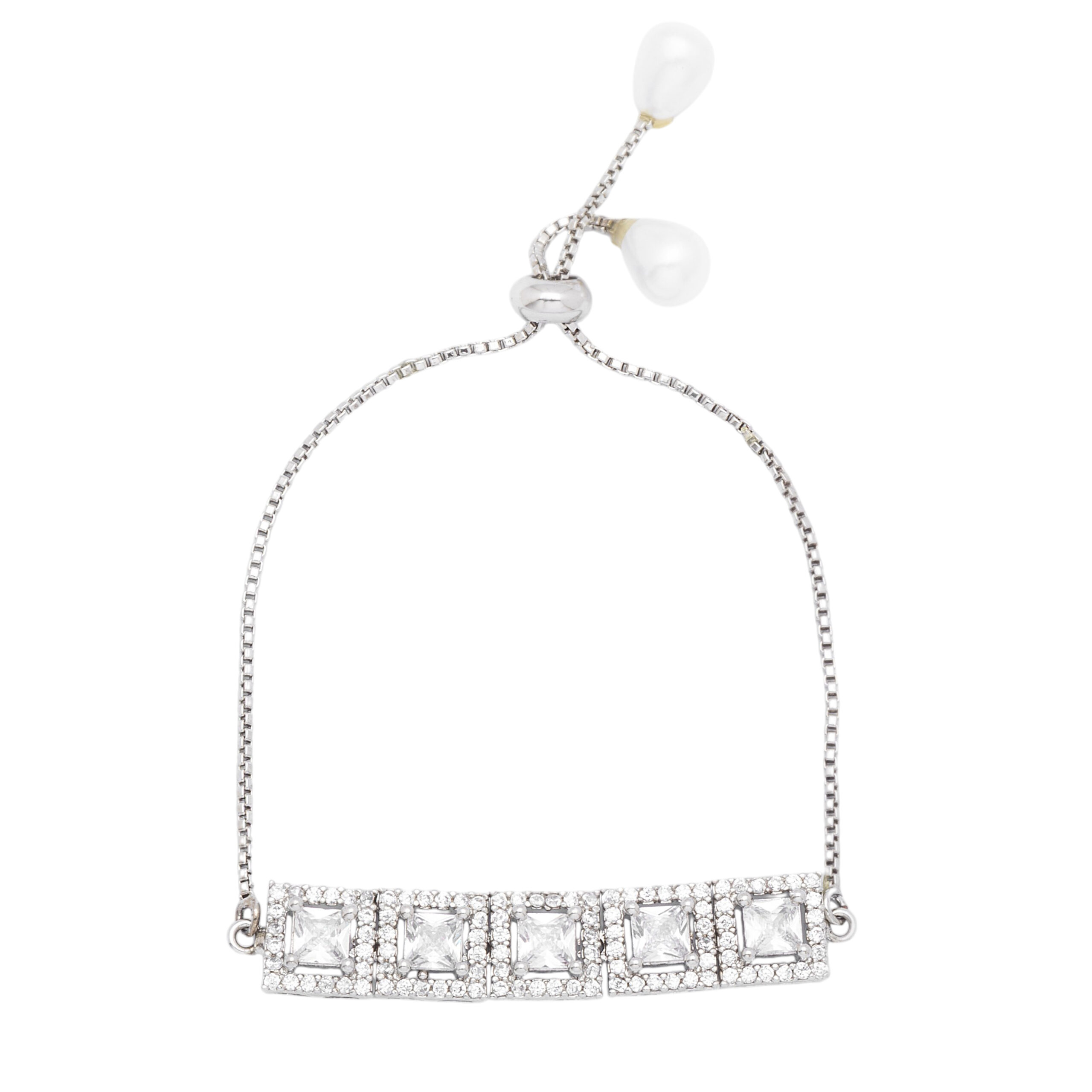 Add a touch of timeless brilliance to your jewellery collection with the Saurastra Square AD Bracelet by Deetya Jewellery. This elegant, silver-plated bracelet features five square-cut crystals, each surrounded by a halo of shimmering micro-pavé American Diamond (AD) stones. The design of the Saurastra Square AD Bracelet combines symmetry and sparkle, offering a refined, statement-worthy look that pairs beautifully with both traditional and modern outfits.