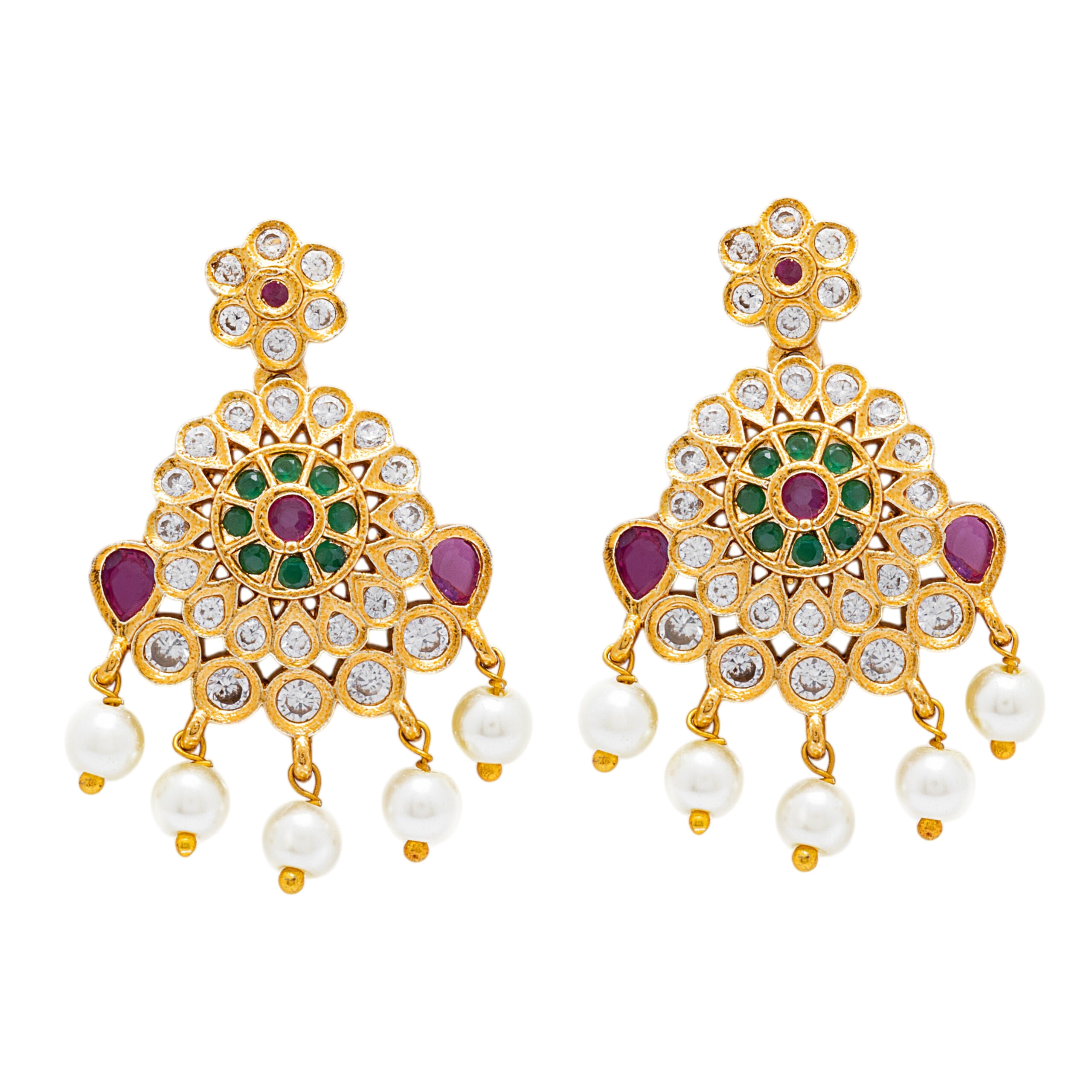 COORDINATED EARRINGS WITH CHANDBALI SILHOUETTE include floral tops, emerald and ruby-colored accents, and delicate pearl hangings, offering a complete festive look