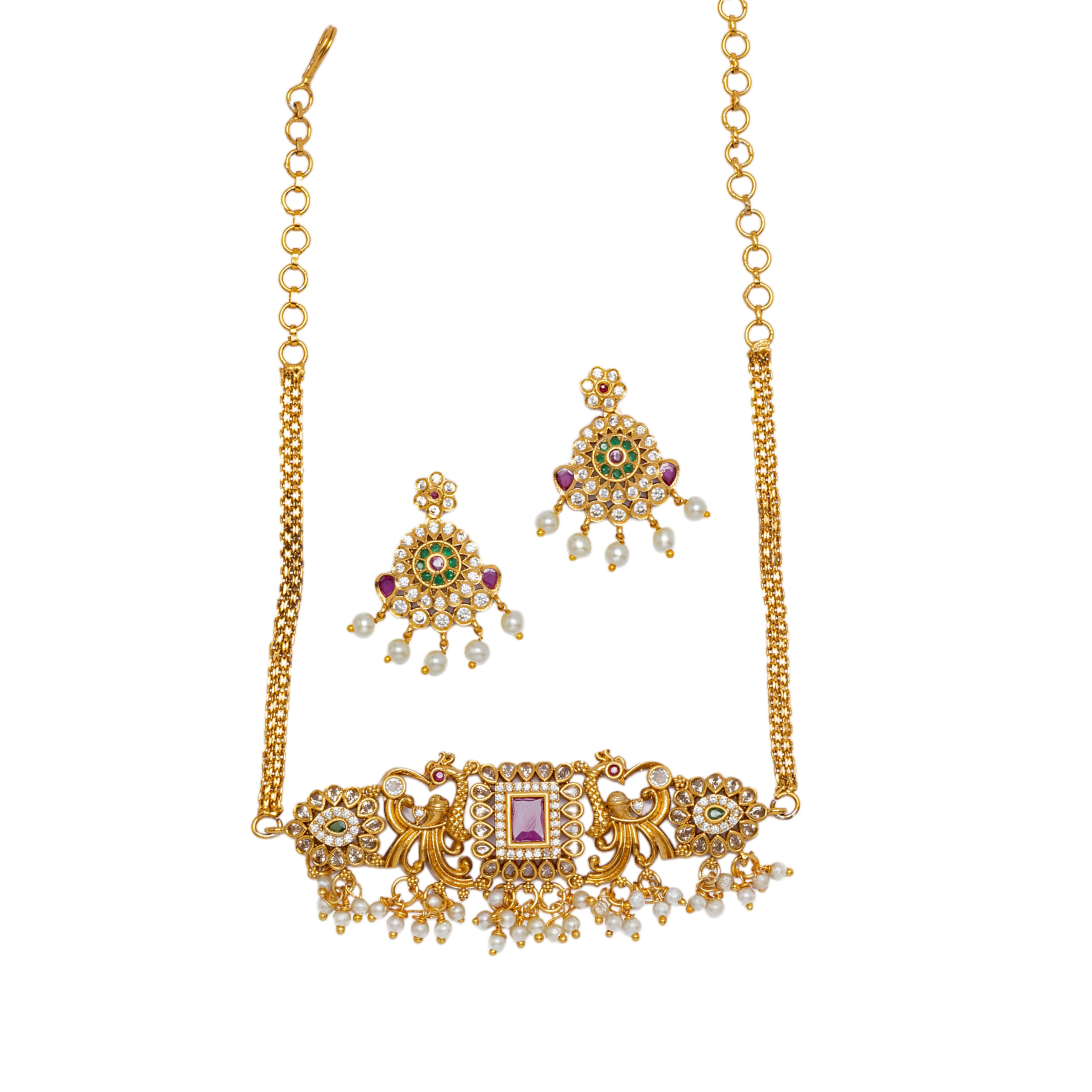 Add timeless grace to your festive and bridal wardrobe with Deetya Jewellery’s handcrafted peacock necklace set. This antique gold-plated design blends traditional Indian artistry with modern elegance, making it a standout piece for any celebration.
