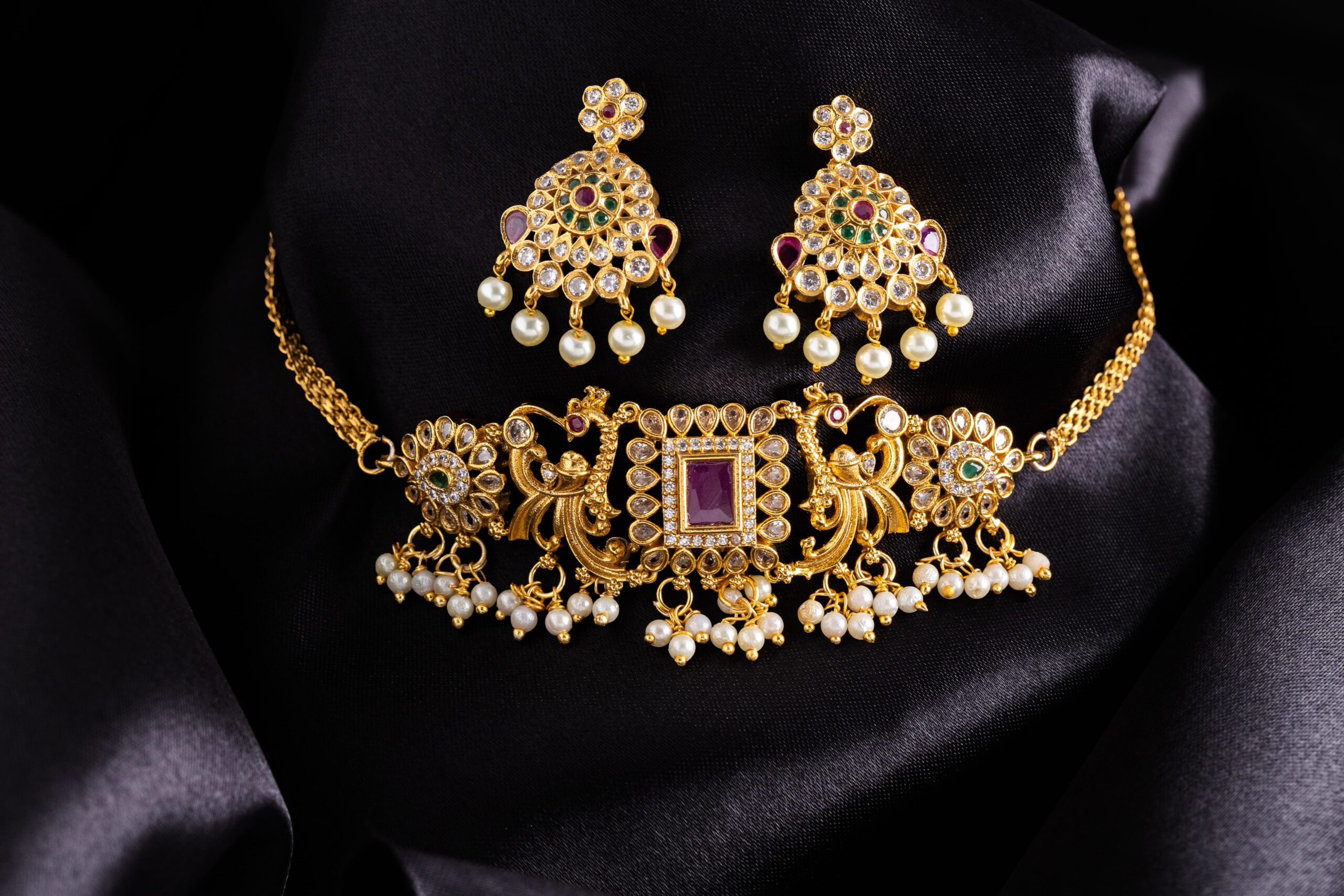 HANDCRAFTED PEACOCK AND FLORAL MOTIFS accent the choker design, enhanced with intricate filigree detailing and finished with cascading pearl bead drops for graceful movement