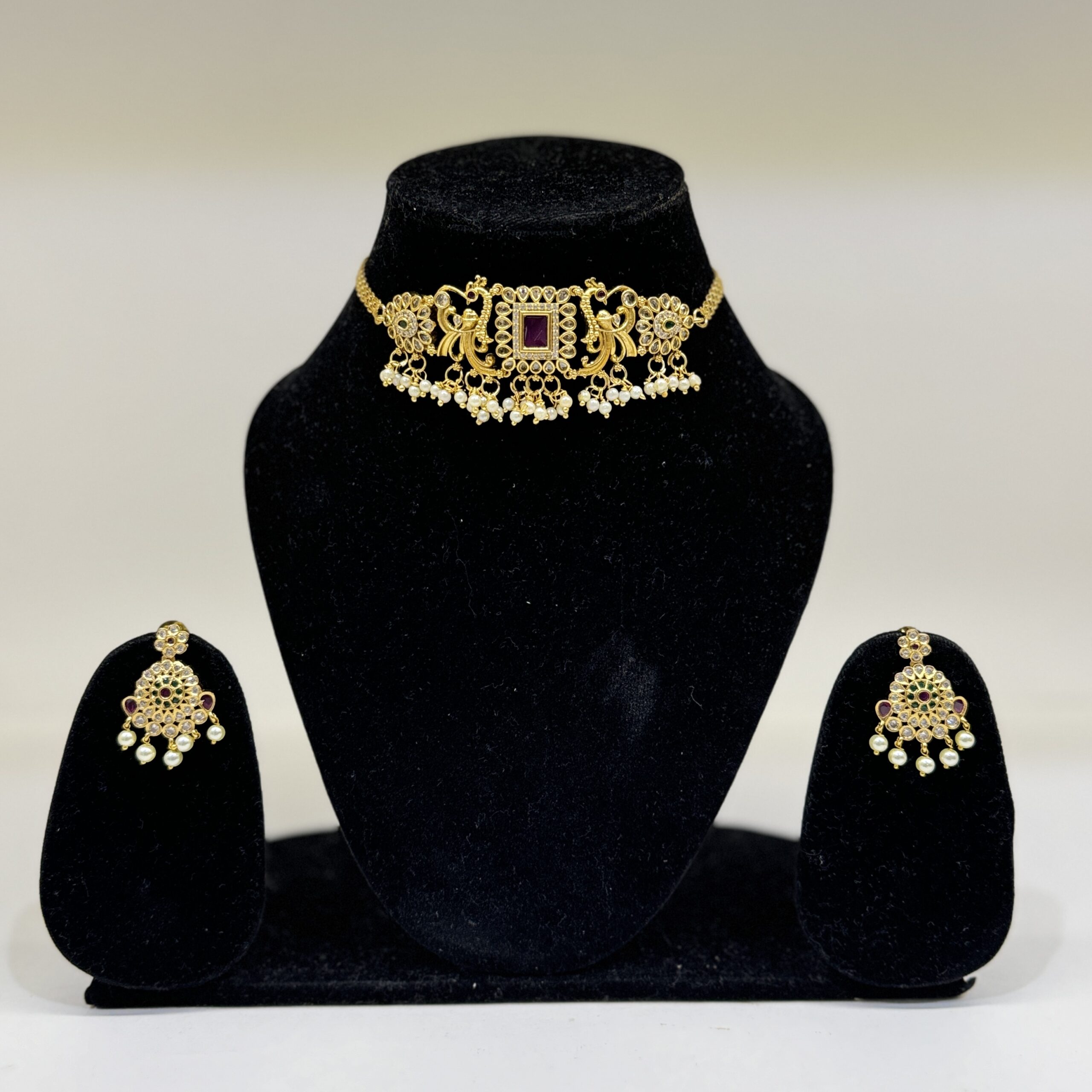 At the center of the necklace is a rectangular ruby-hued stone, bordered by brilliant American Diamond (CZ) stones. On either side, ornate peacock motifs with green and red accents elevate the regal look. The design is further enhanced with delicate filigree work and dainty pearl drops, which add soft movement and charm. Together, these elements create a rich, heritage-inspired piece with a vintage gold finish.